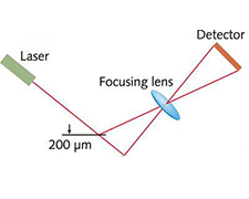 在激光三角檢測技術(shù)中,用一精細(xì)聚焦的激光束來掃描圓片表面,光學(xué)系統(tǒng)將反射的激光聚焦到探測器(圖1)。采用3D激光三角檢測術(shù)來檢測微凸點(diǎn)的形貌時,在精度、速度和可檢測性等方面它具有明顯的優(yōu)勢。這一檢測技術(shù)目前所面臨的挑戰(zhàn)包括有凸點(diǎn)的尺寸和凸點(diǎn)之間的間隔都很小,以及在整個圓片上布滿有數(shù)百萬個凸點(diǎn)。