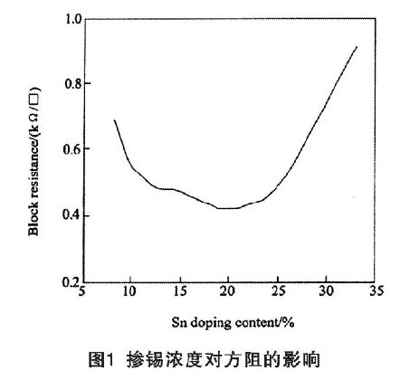 圖1為摻雜濃度對ITO薄膜方阻的影響關系曲線。摻錫濃度較小和較大時ITO薄膜方阻均較大,摻錫濃度在20%附近ITO薄膜方阻最小。這是由于通過錫離子摻雜,一方面會形成電子施主,另一方面又會引起晶格畸變,產(chǎn)生陷阱能級,形成電子復合中心。錫離子摻雜較少,電子濃度小,方阻較大;錫離子摻雜過度,陷阱態(tài)密度大,使電子復合增多,方阻較大;適度的錫離子摻雜提供了更多的電子,提高ITO薄膜的電導率,方阻較小。此實驗結論與范志新等人得出的有關溶膠-凝膠法制備ITO薄膜的最佳摻雜量的理論結果ω(Sn)=15.79%基本吻合。
