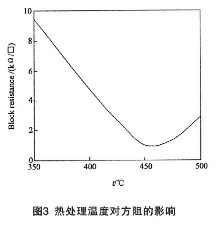 圖3為熱處理溫度對ITO薄膜的方阻影響關系曲線。熱處理溫度較低時ITO薄膜方阻較高,隨著熱處理溫度的增加ITO薄膜的方阻直線下降,熱處理溫度達到450℃時ITO薄膜方阻降為最低,熱處理溫度高于450℃后ITO薄膜方阻由減小轉為增加。熱處理溫度較低時,ITO薄膜晶粒較小,方阻較大;隨著熱處理溫度的升高,ITO薄膜晶粒增大,有利于方阻的下降;當熱處理溫度接近500℃附近時晶格畸變嚴重,抵消了晶粒增大有利于方阻下降的影響,導致熱處理溫度超過450℃后,ITO薄膜方阻轉為增加。