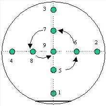 其實(shí)外延片的生產(chǎn)制作過程是非常復(fù)雜的,生產(chǎn)設(shè)備基本上選用原裝進(jìn)口為主;在展完外延片后,下一步就開始對(duì)LED外延片做電極(P極,N極),接著就開始用激光機(jī)切割LED外延片(以前切割LED外延片主要用鉆石刀),制造成芯片后,在晶圓上的不同位置抽取九個(gè)點(diǎn)做參數(shù)測(cè)試,如圖所示: