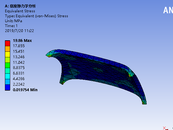 可以通過(guò)最后的結(jié)果圖發(fā)現(xiàn),底座的最大位移出現(xiàn)在底座的中心處,位移量為1.86mm,數(shù)值上是比較小的;最大應(yīng)力值出現(xiàn)在底座的四個(gè)支撐點(diǎn)上,最大應(yīng)力值為19.86MPa,而工程abs塑料的許用應(yīng)力值為24.5MPa.可以看出即使在3000Pa的壓力作用在整個(gè)面下,底座仍然能承受.那么在通常在手寫(xiě)板上寫(xiě)字的時(shí)候,底座仍然能承受住壓力,不會(huì)產(chǎn)生較大變形.但是有一點(diǎn)需要注意:由于底座是靠4個(gè)支點(diǎn)支撐,所以底座上不能放置太重的物體,以免支點(diǎn)上的應(yīng)力大于abs的許用應(yīng)力,致使底座變形.