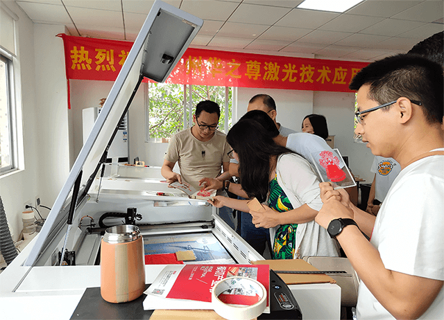 學院老師參觀設備中,對設備有著濃厚的興趣;老師手中拿著的樣品都是由現場的激光設備制造而成.