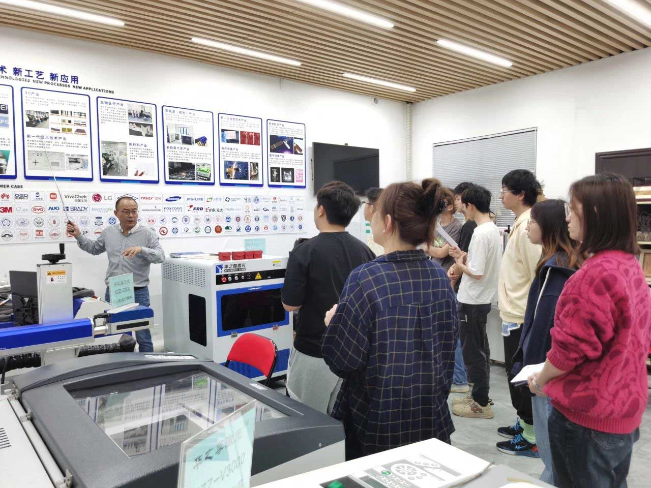 為了讓學(xué)生們更好地了解激光行業(yè)的發(fā)展趨勢(shì),華之尊激光總經(jīng)理·秦斌帶領(lǐng)學(xué)生參觀公司的激光技術(shù)應(yīng)用研究區(qū)、設(shè)備區(qū)、應(yīng)用作品展示區(qū)、新材料·新技術(shù)·新工藝·新應(yīng)用探究區(qū),并為他們做了詳細(xì)解說(shuō),使學(xué)生了解了激光技術(shù)的最新應(yīng)用和行業(yè)動(dòng)態(tài)。為后續(xù)的設(shè)備培訓(xùn)打下堅(jiān)實(shí)的基礎(chǔ)。